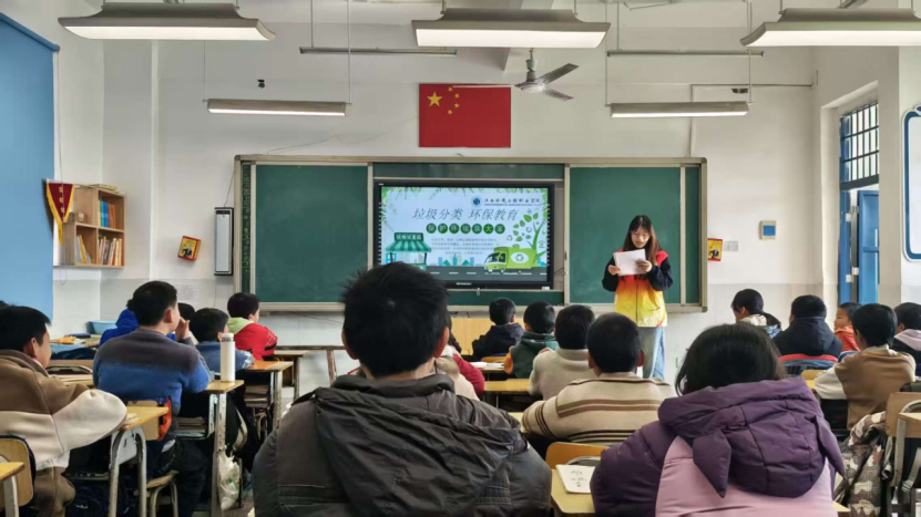 在小溪中心小学五年级一班的课堂上,志愿服务团队用“知识宣讲+趣味互动”的形式,让教育更有温度。谭熠辉同学围绕垃圾分类知识展开讲解,将专业环保知识转化为孩子易懂的语言;古慧琼同学设计趣味问答环节,充分调动课堂氛围,让孩子们在互动中掌握分类技巧。随后,余岚歆同学带来红色文化宣讲,通过詹天佑攻坚克难筑铁路、黄文秀扎根基层助脱贫的感人事迹,让红色基因在孩子们心中种下种子。程霞老师在总结时与同学们亲切交流,鼓励大家既要做守护绿水青山的“环保小卫士”,更要做传承红色精神的“薪火传承人”,让理想信念从小扎根。