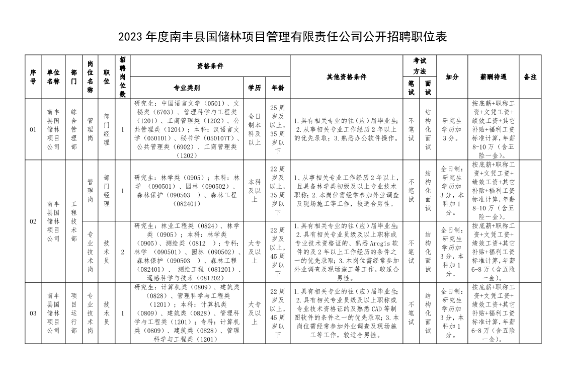 2023年度南丰县国储林项目管理有限责任公司公开招聘职位表