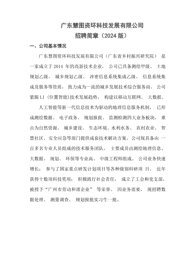 广东慧图资环科技发展有限公司招聘简章(2024版)