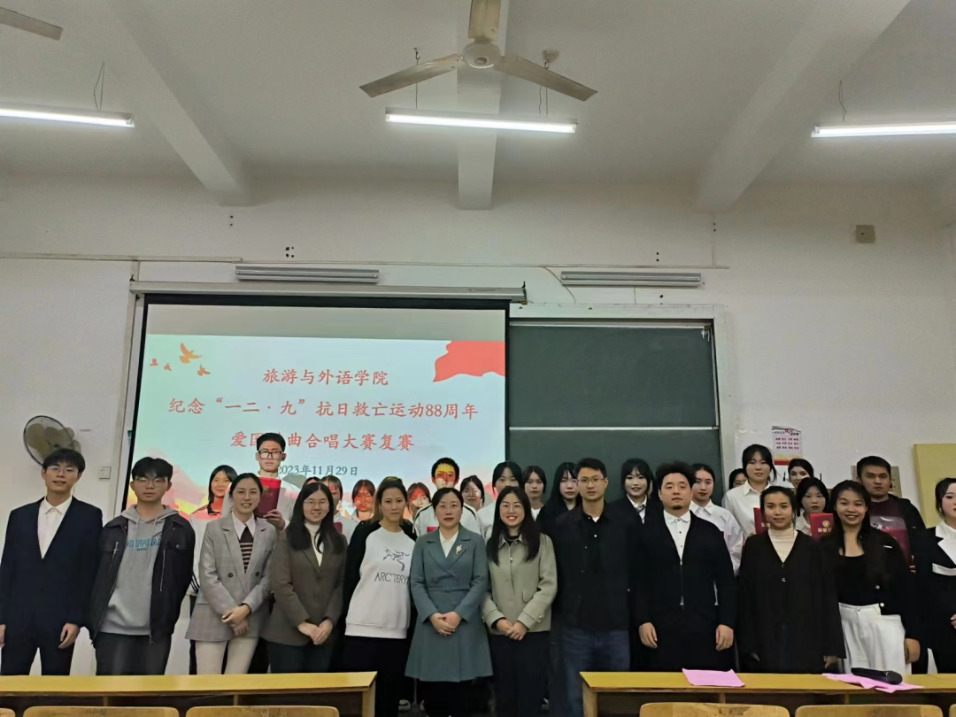 为纪念“一二·九”抗日救亡运动88周年,引导广大学生进一步了解历史、铭记历史,唱响爱党爱国的时代主旋律;进一步增强班级凝聚力,丰富校园文化生活,旅游与外语学院于2023年11月29日19:00在红旗校区乐学楼315举办了纪念“一二·九”抗日救亡运动88周年爱国歌曲演唱大赛复赛。