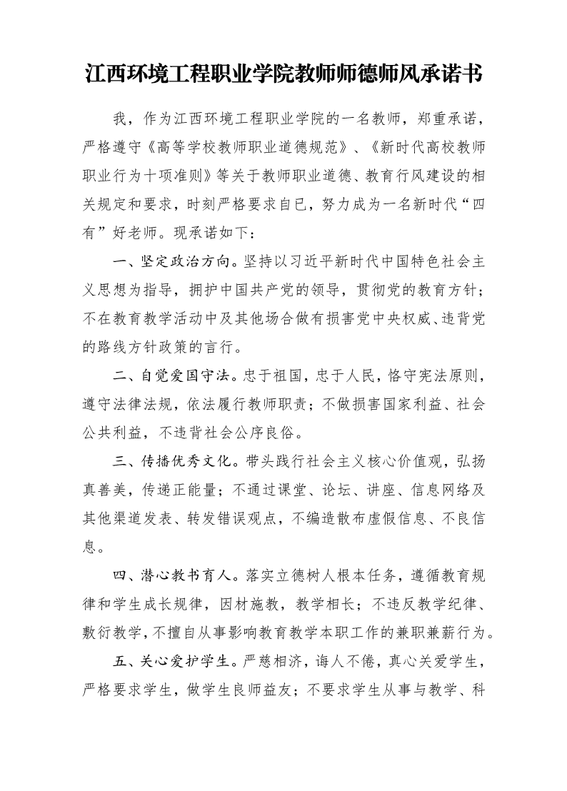 江西环境工程职业学院教师师德师风承诺书