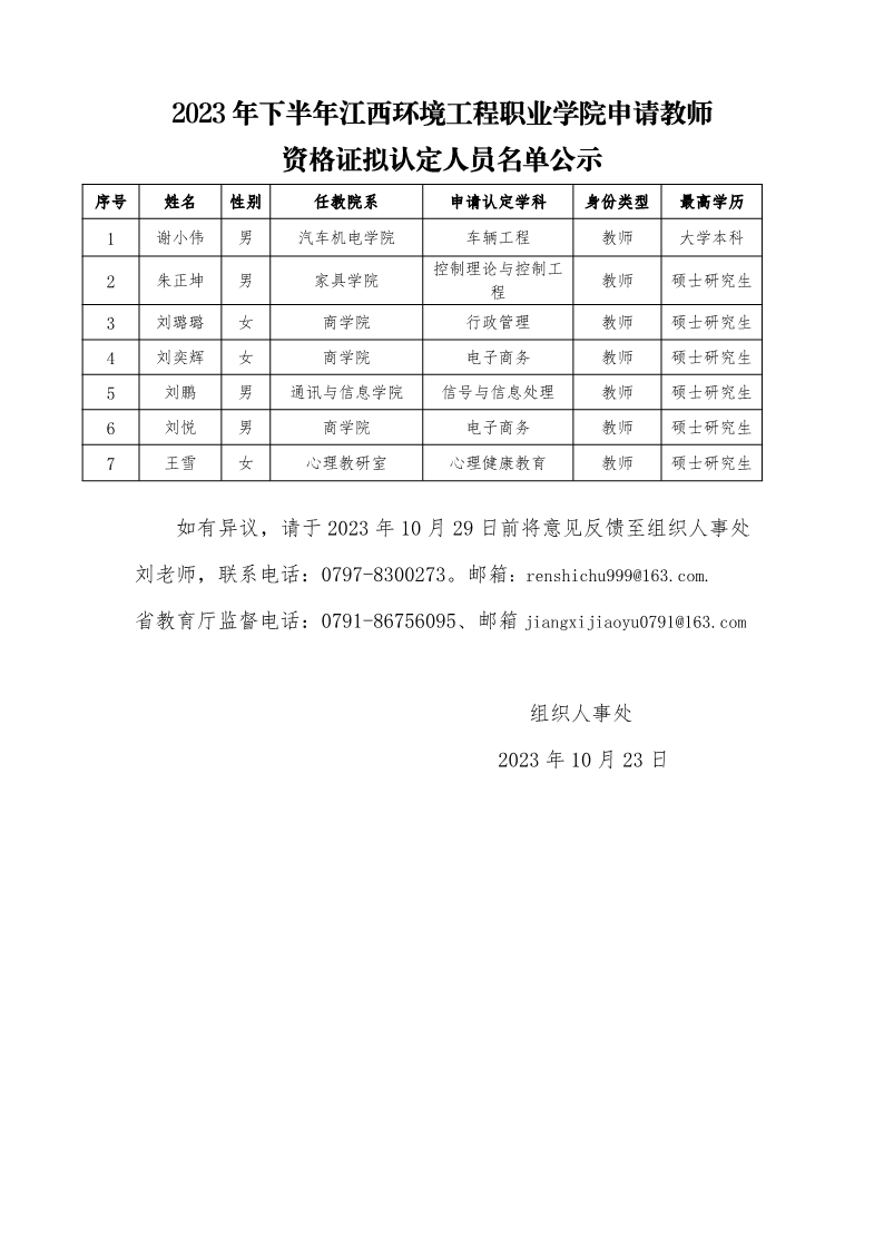 江西环境工程职业学院2023年下半年申请教师资格证拟认定人员名单公示