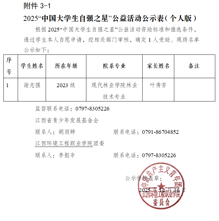 接江西省青少年发展基金会通知,日前,中国青少年发展基金会联合新东方教育科技集团启动2025“中国大学生自强之星”公益活动,我校有1个资助名额。经学生自主申报、二级学院推报,共收到7名学生的申报表。经团委评审,综合7名学生在校表现、个人事迹及成果表现,拟推报现代林业学院林业技术(三定向)专业学生谢志强参与评选。