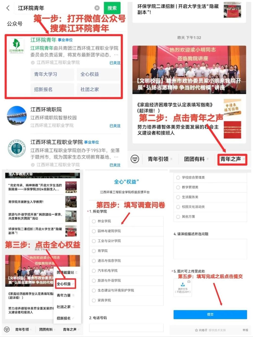 1、微信搜索学校公众号“江环院青年”找到全心“权益”平台填写调查问卷反馈。