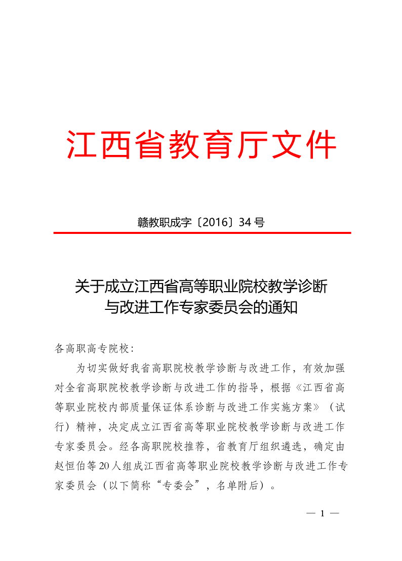 赣教职成字【2016】34号 关于成立江西省高等职业院校教学诊断与改进工作专家委员会的通知 来源: 发布时间:2019-08-13 15:44:04 浏览次数: 次 【字体:小 大】 终审:质量办 分享到: 【打印正文】