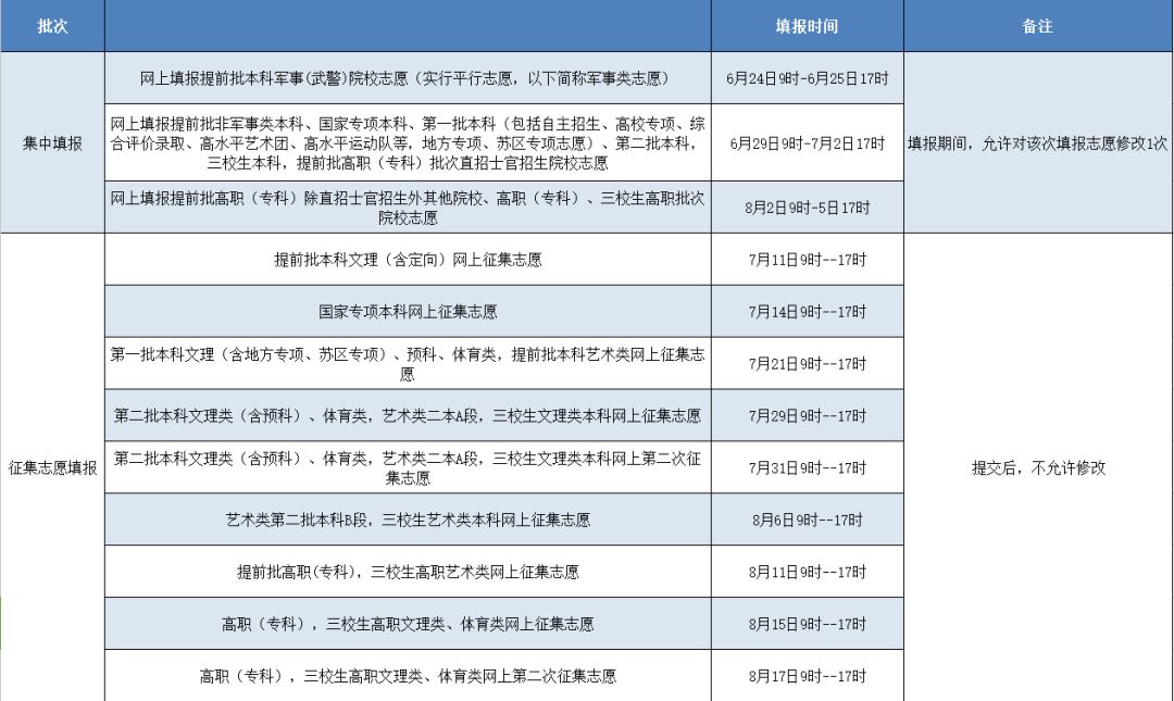 网上填报提前批非军事类本科、国家专项本科、第一批本科(包括自主招生、高校专项、综合评价录取、高水平艺术团、高水平运动队等,地方专项、苏区专项志愿)、第二批本科,三校生本科,提前批高职(专科)批次直招士官招生院校志愿